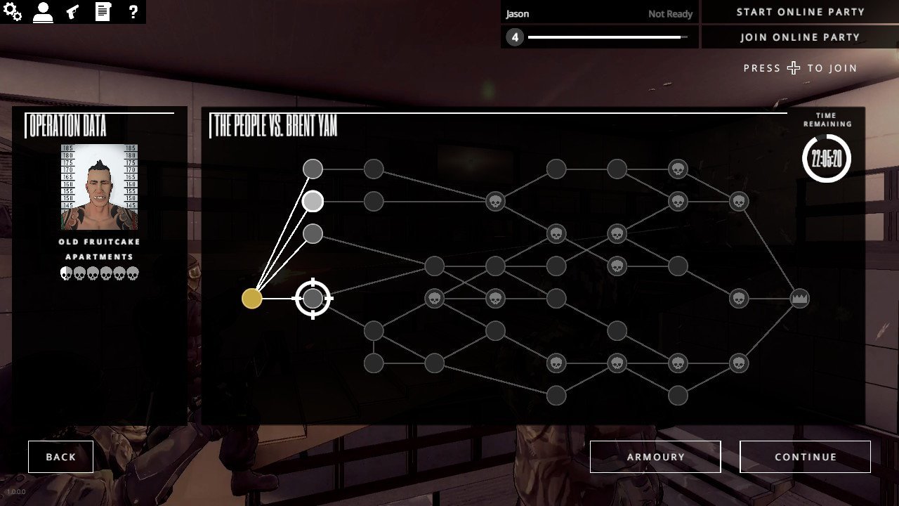 RICO isn’t a standard FPS, however. It has a rogue-like design; players are tasked – either alone or in two player co-op – with taking down bad guys, collecting evidence and/or defusing bombs in a number of different buildings (though the variety of these buildings does seem limited, which is likely due to the procedural generation of levels). Missions form part of a randomly generated campaign, with a choice of which mission to tackle next – you’re given an idea of the difficulty of the mission before starting, along with an idea of the mission’s setting. Each campaign is a series of missions on a branching map, with the route being decided by the player, depending on the challenge and/or task they want to tackle next (though limited by the path you find yourself moving down as you progress).