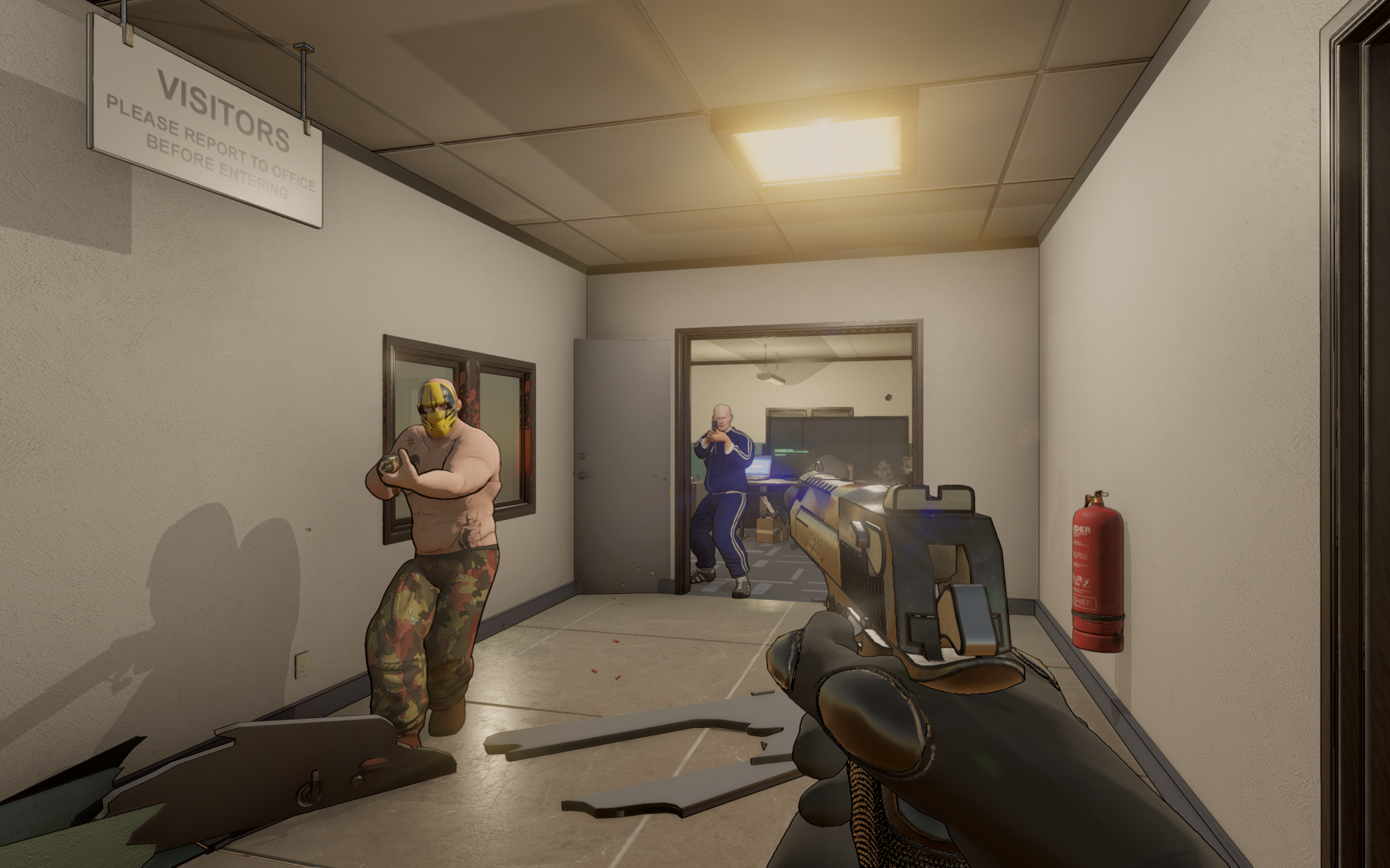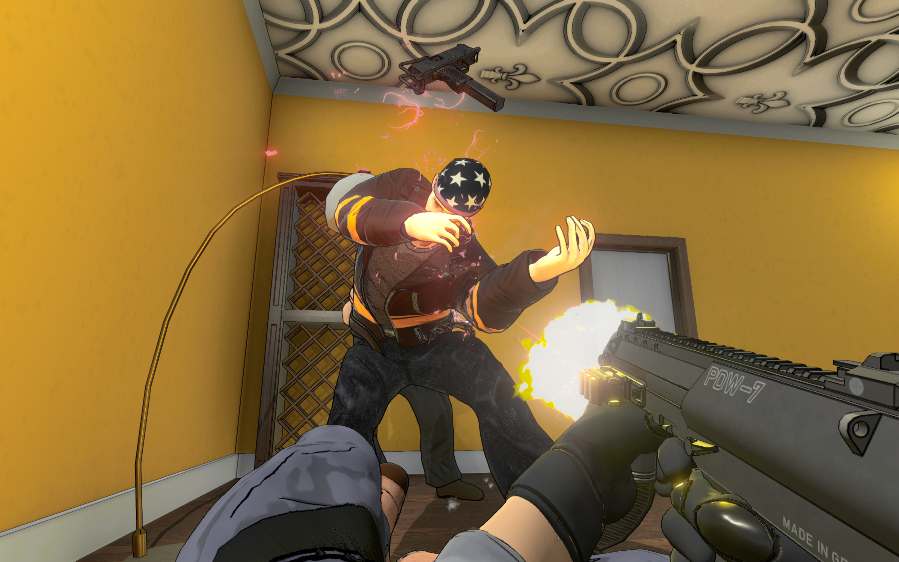 That’s the mission structure, but what about the actual moment-to-moment gameplay? Here’s another few elements that set RICO apart; rather than just working your way through a randomly generated, criminal infested building in typical first person action style, RICO has a few wrinkles to the gameplay to spice up the proceedings. Firstly, rooms are cleared one at a time; until you’ve cleared a room of enemies, you can’t open a door to another room if there are criminals lurking in that one too. To add to this, the method of opening a room sees your player kicking the door down, setting off a brief few seconds of slow motion – in which players aim to take down as many bad guys as possible before time speeds back up to normal again.