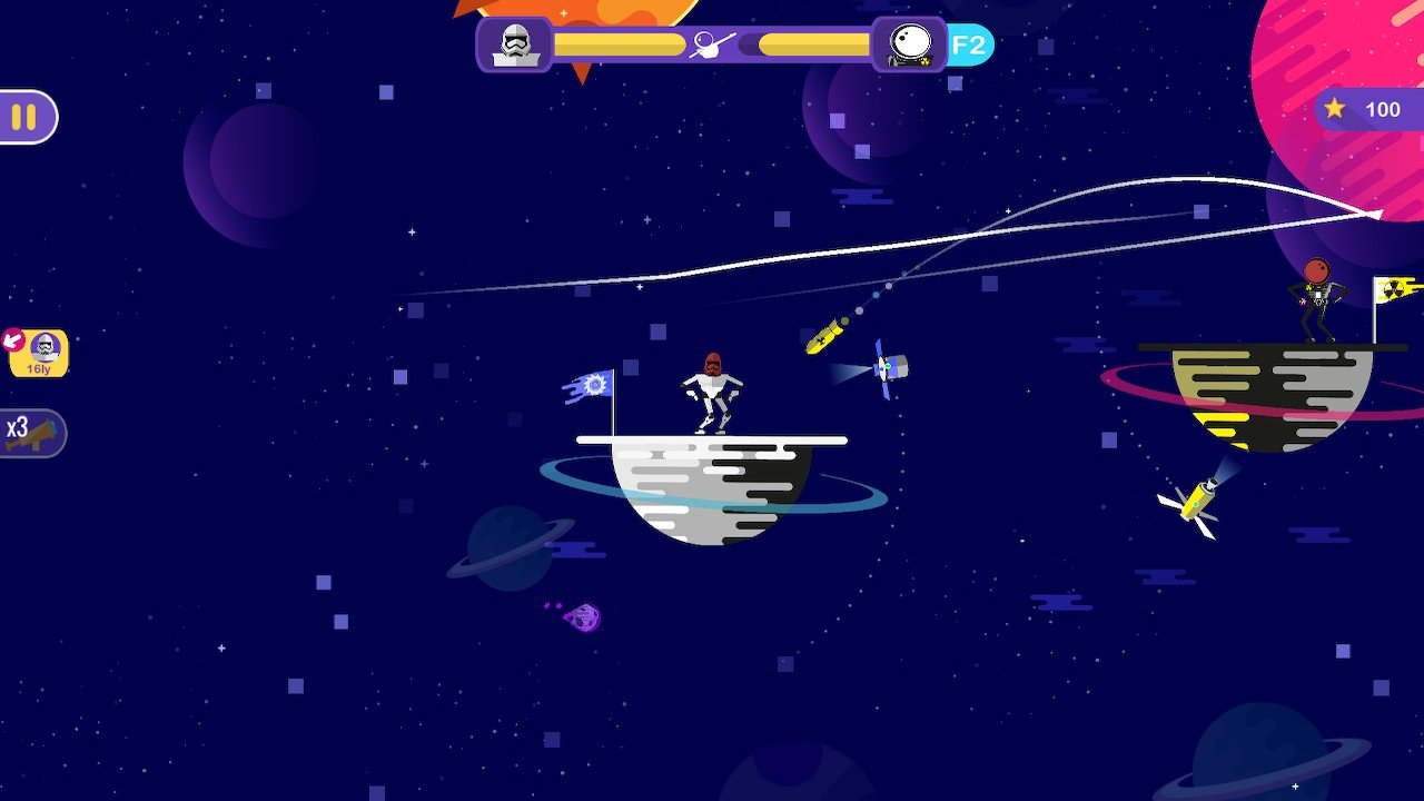 There’s not much beyond the single mechanic of lining up a shot and releasing it, beyond a few obstacles, varying effects of weapons (per character) and the occasional gravitational pull on your shot. Though the price is very low, if you’re looking for a primarily single player experience, it’s not a game that I’d recommend – there’s just not enough content here to justify a purchase for a lone player, unfortunately. That said – and especially with such a low price – you can get some decent mileage out of the multiplayer mode, so if you’re looking for something simple to play with a friend that isn’t too taxing, you could do worse than Mr Blaster.