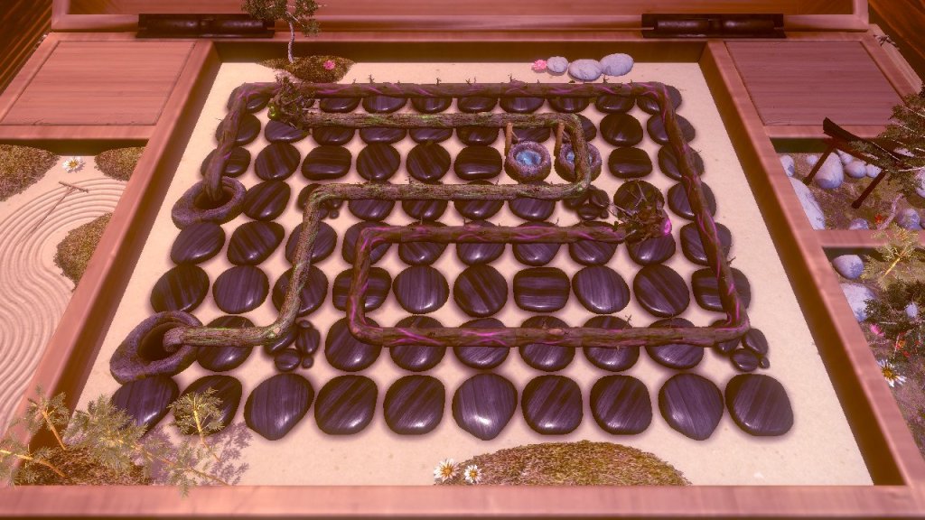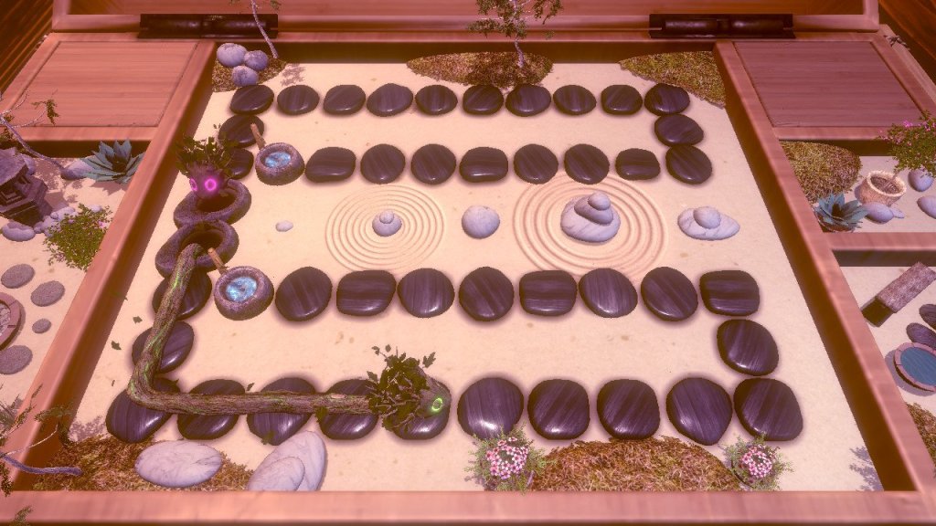 A puzzle game featuring two snake-like plant creatures trying to make their way to the pots filled with water in a small zen garden, OmoTomO is very straightforward to play. Taking control of both OmoTomO creatures at once (or, in co-op mode, one creature each), you’ll use only the Joy-Con’s stick to move them in a specific direction. They’ll move along the pattern of pebbles until they hit a wall, obstacle or another part of themselves (or the other creature), so careful planning is required if you want to get each of them to the correct spot in the stage. It has the feel of mobile phone classic Snake, with failure occurring if your creature is unable to move; you can, at this stage, reset the level with a single button press and try again.