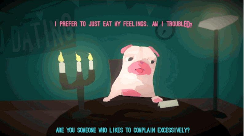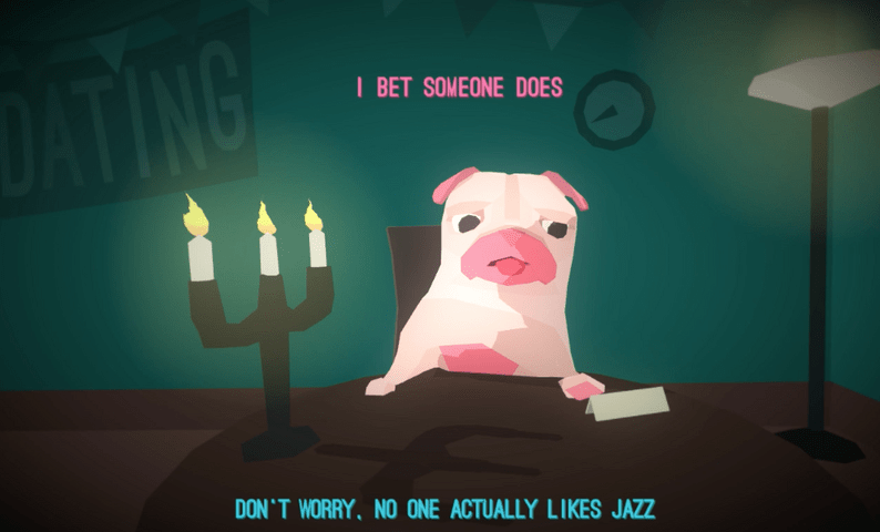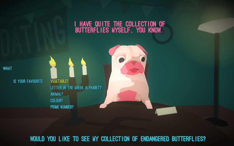 One thing’s for sure though, I don’t think I’d ever have the opportunity to speed date a succession of pugs. Hot Date sees you sat at a romantically candle lit table, accompanied by inoffensive musak, as you try to connect with a never ending supply of lovestruck pugs.