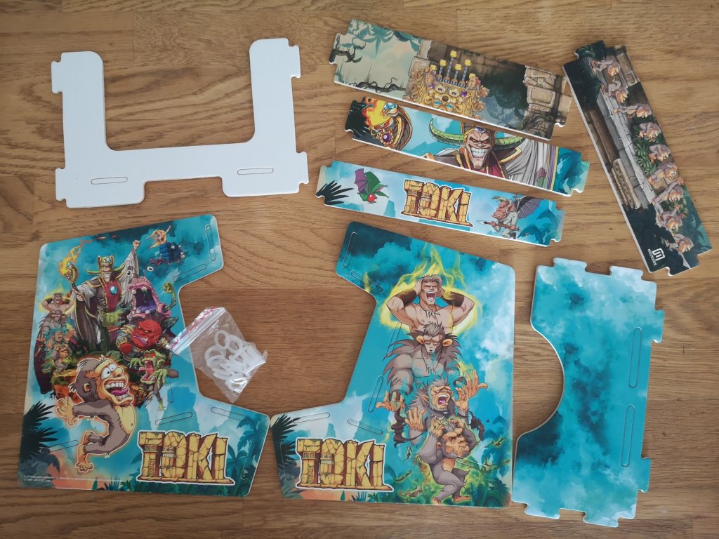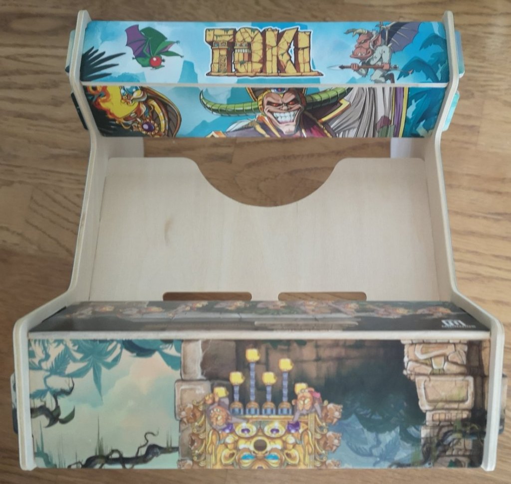 Though it doesn’t hold your JoyCons like the PixelQuest cardboard arcade kit does, it feels a lot sturdier (being made of light wood rather than cardboard) and it is, of course, completely covered in Toki art. It’s held together by some surprisingly strong little rubber bands at each join too.