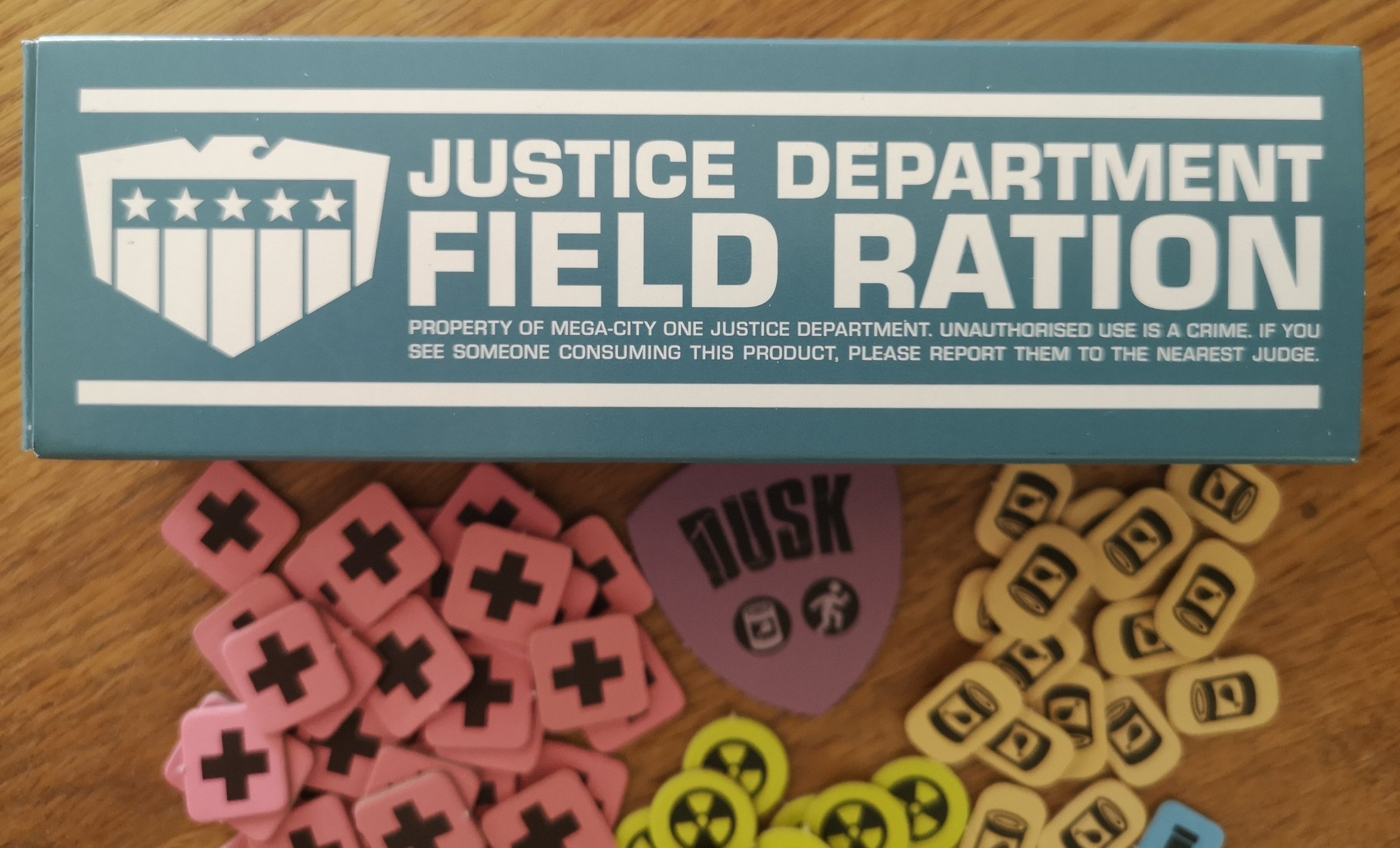 The Dredd comic strip in the rulebook, which acts as a prologue to the events of the game is an excellent touch, but hough the oversized cards, book-esque box and brilliant component holder (in the form of a Justice Department Rations pack!) are all superb, the tokens used feel really thin and flimsy. It doesn’t detract from the overall experience, but I do wish they’d been of higher quality.