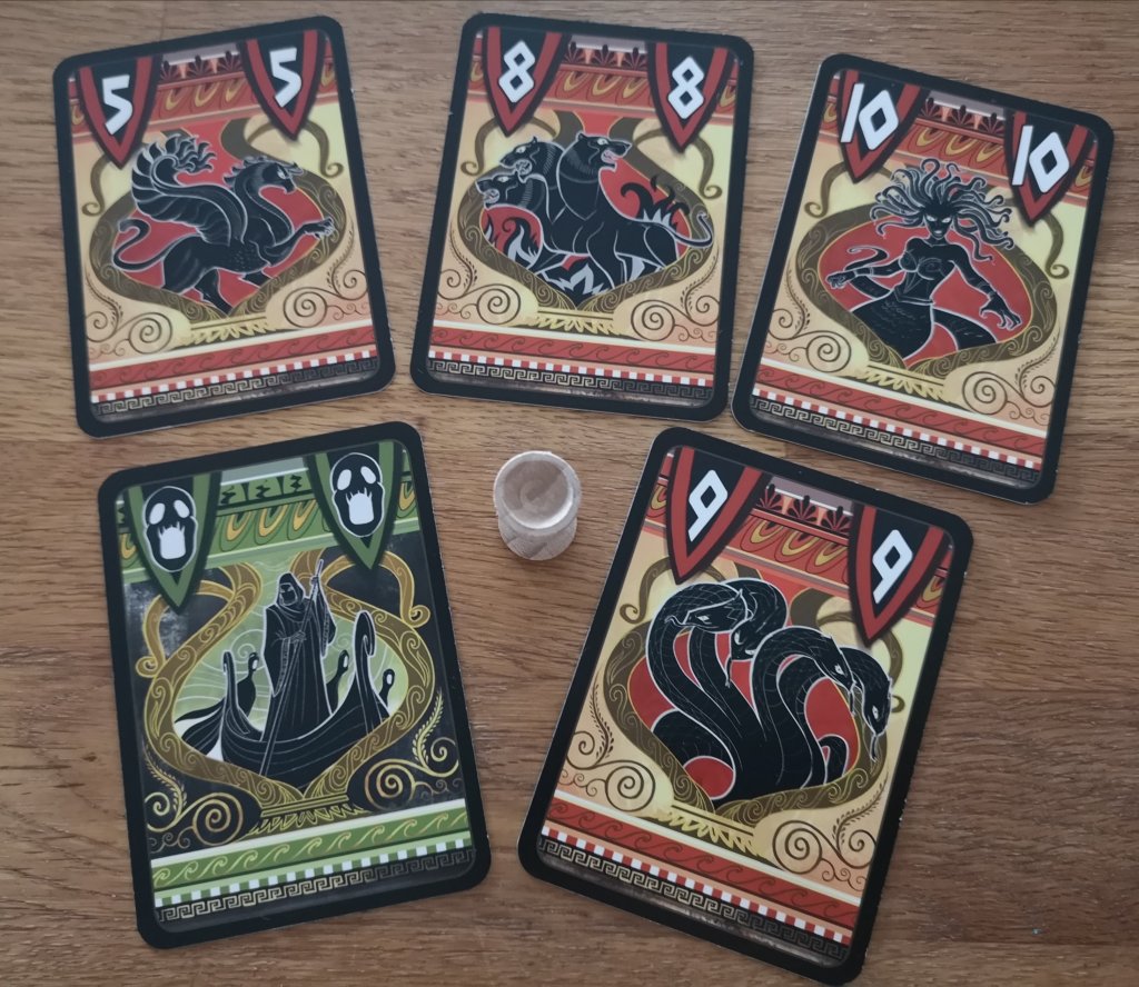 Once either one, two or three cards have been accepted or refused (going back to whoever offered them), they’re revealed and kept face up in front of the player they went to. Numbered creatures are added to the owning player’s score (with a set total needed to win, depending on the number of players – and in a further twist, a set of 1-2-3 scores 10 points). Charon cards are also kept; collect three of those and you’re eliminated – it’s straight to the underworld without any supper for you. The game end is triggered under the following conditions: a player meets the score target, there’s only one player left following the others being eliminated or there are a certain number of face up Charon cards in play (at which point the remaining player with the highest score wins).