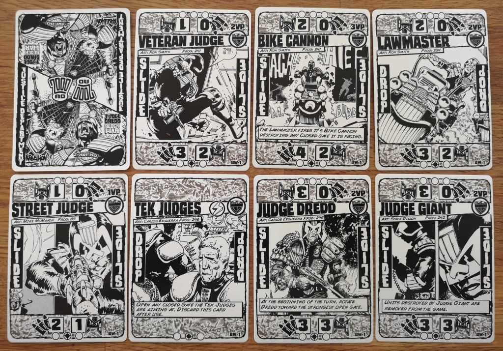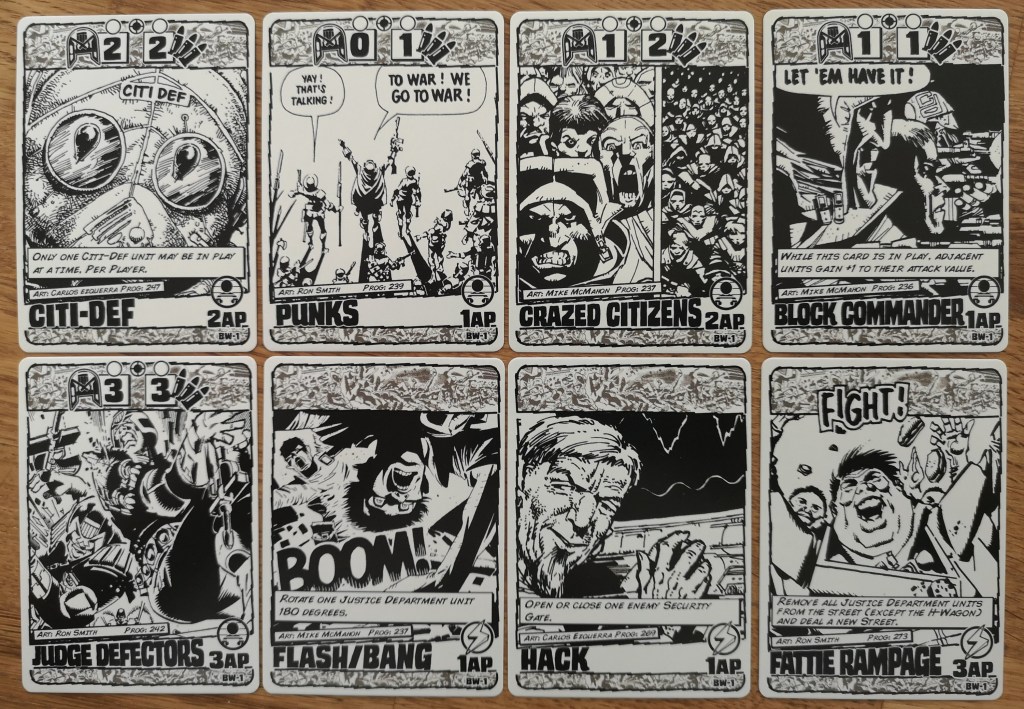 The basic, action point-based gameplay in Block Wars is superb, allowing players an awful lot of flexibility in how to approach each turn. To add to the positives, the artwork and general look of the game is wonderful – with art taken straight from the original black and white comic panels in Block War-related Dredd stories. It gives the game a striking, detailed black and white look on the table that feels pretty unique – and is very appealing to a lifelong Dredd fan such as myself. There’s even an appearance from Mega City One’s MVP, Dredd himself, who’ll show up to dispense his own brand of justice when drawn from the Justice Department deck.