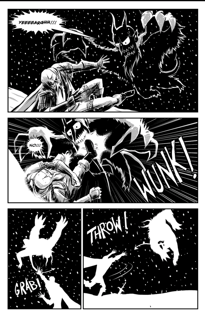 Baron’s art is absolutely stunning; the use of contrast giving an incredible sense of atmosphere in the quieter scenes, with a punchy dynamism bringing a real action movie quality to the battle between Nick and his eponymous nemesis. The design of our hero tells of a long history of drawn out battles, while the more cartoony look of Krampus gives the sense of a more mischievous character who enjoys pitting himself against our weary, battle-scarred protagonist.