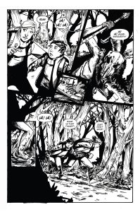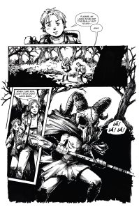 The art is excellent throughout, with great use made of shading in the stark black and white style employed by penciller Wayne Lowden. Character and creature design is strong and distinctive, with only one or two panels featuring facial expressions that struck me as odd under the story’s circumstances. The design of the creature known as a Zoog was a particular highlight for me, but all of the gore, goo and goat-skulls are consistently excellent, with clear storytelling and interesting composition.