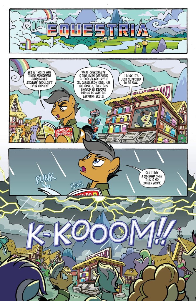 Though that’s the crux of the main story’s beginning, there’s a backup strip too – which is a bit more focused on the Transformers than the ponies, with a smaller scale battle between Starscream and the heroic Arcee, along with a few quadrupedal friends.