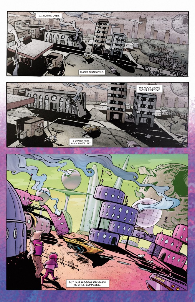 The story of Chuck and his loyal canine companion, Addie, Orphans of the Impact Winter sees the boy and his dog trying to survive in a harsh world that is under threat by the moon falling out of the sky. Throughout the lonely, desperate struggle for survival, Chuck imagines himself as an intrepid space explorer in a bubblegum sci-fi universe. The world he conjures up is rendered in beautiful colours and filled with gorgeous retro-futuristic designs; far removed from the bleak, muted, harsh reality that he would otherwise have to deal with.