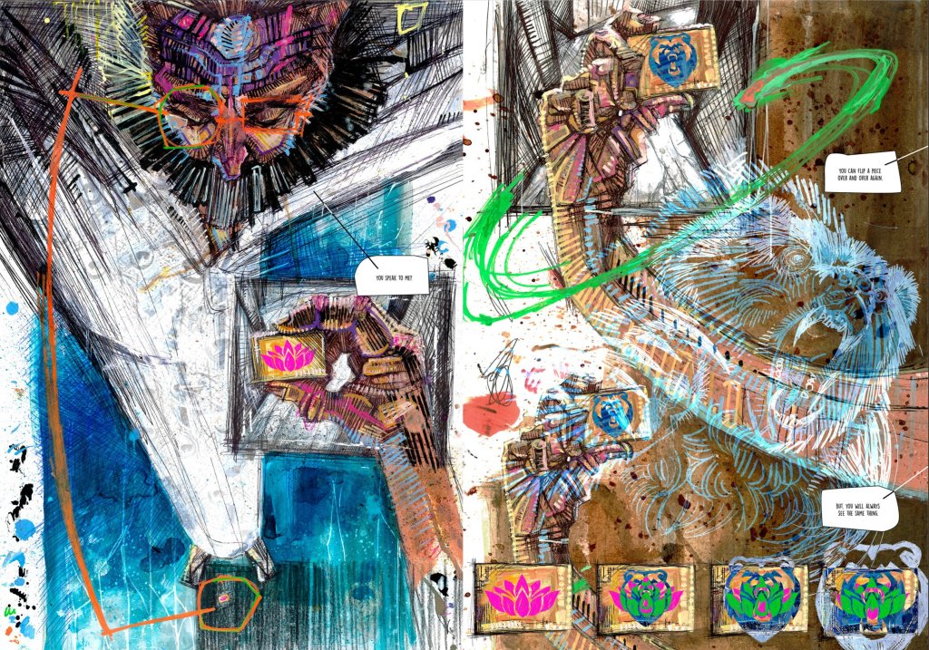 The artwork really is something special too; though perhaps most closely recalling the mixed media, multi-style and many-layered, surrealist approaches of artists such as Bill Sienkiewicz, Simon Bisley or Ashley Wood, Schwanz’s illustrations are genuinely, entirely unique.
