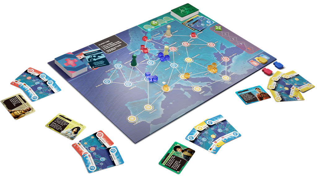 Each player has a number of actions on each turn – these can be used to move, remove disease cubes from cities, share cards with other players, use said cards to travel to cities further than normal movement would allow and also use sets of coloured cards to cure diseases.