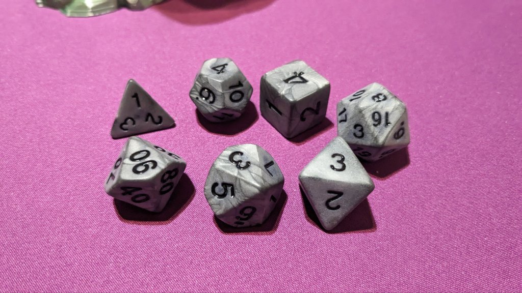 In the third bag, I uncovered some neat looking, matte-finish grey dice – which looked a little like they had a sort of stone effect.