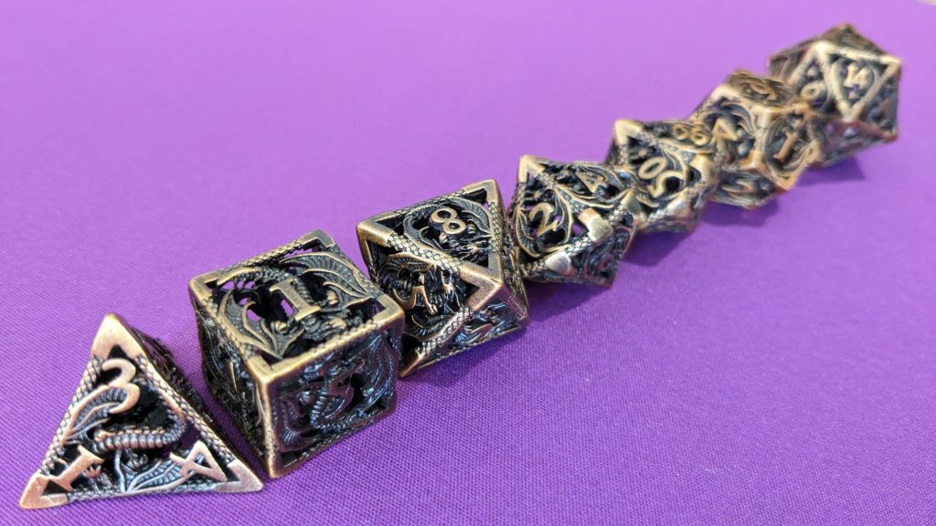 As you can see – and, as their name reveals, they’re hollow dice with a bronze metal finish; not only that, but each face on every die features an intricate, detailed dragon.