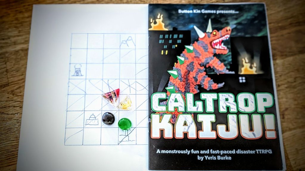 Gameplay-wise, Caltrop Kaiju! takes the form of a solitaire puzzle/strategy game, in which you draw (or print) the town map, then use counters to represent yourself and the Kaiju, with the monster moving according to the roll of 2 four sided dice (d4, or ‘caltrops’, hence the name of the game!).