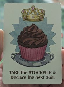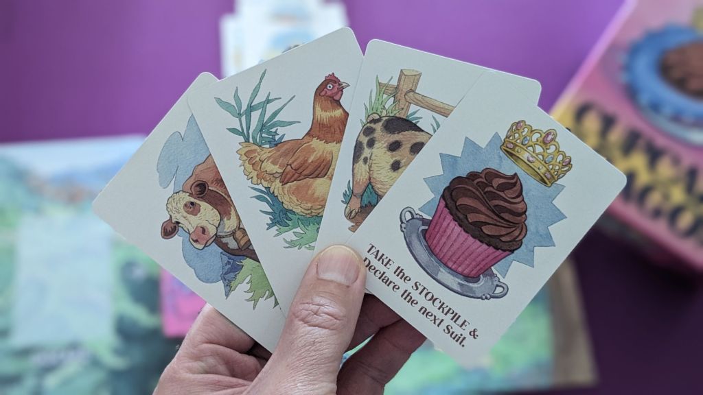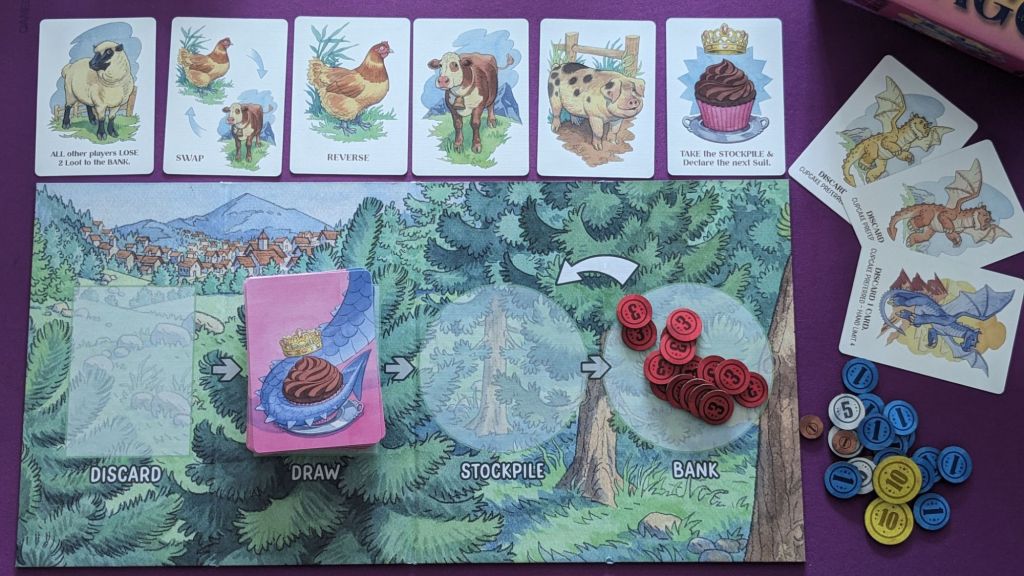 Suits come in the form of different animals: chickens, cows, sheep and pigs. Some of these cards have text with different effects, such as Reverse (which, in a fairly self-explanatory way, reverses the order of play), taking Loot from the Bank, or even giving loot to, perhaps taking it from, another player. Swap cards can change the Suit, but there are also, of course, cupcake cards; these are wild and allow the player who used them to not only take the stockpile of Hoard tokens, but also change the Suit to one of their choice.