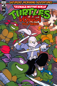 Stan Sakai’s anthropomorphic rabbit, Miyamoto Usagi, has a long history of crossing over with the Teenage Mutant Ninja Turtles, and in keeping with this comic being a close reproduction of the style and content of the 80s TMNT cartoon, he’s known here as Usagi Yojimbo (which is the name of Sakai’s long running comic featuring the bunny ronin), just as he was in the animated series.