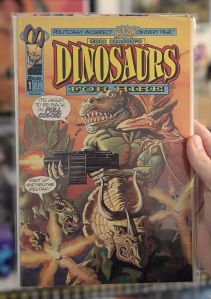The jokes come thick and fast in this issue, which takes aim at the then-in-vogue violent ‘heroes’ from the biggest comics publishers, as well as plenty of self-referential mentions of the Dinosaurs For Hire video game, and the animated show from Fox (the former of which did make it to market, whereas the latter did not).