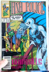 Fish Police began life as an indie comic, created (as well as written and drawn) by Steve Moncuse back in 1985. Initially self published (under the Fishwrap Productions banner), it was picked up, reprinted and even partly colorised by publisher Comico, who unfortunately went bankrupt a few years later. Apple Press were next to publish Fish Police, and Marvel Comics re-published the first six issues of the series, albeit in colour, around the time that it was adapted for TV, and it’s the first issue of this run that I’m checking out.