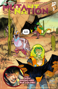 In no rush to read this series, I’m a little behind with Teenage Mutant Ninja Turtles: Mutant Nation. In this third issue’s first story, Raphael’s attempt to rescue his little dinosaur friend (the adorable Pepperoni) goes very wrong, and in the second story, Casey Jones challenges Karai after she crosses a line, with surprising, potentially fatal consequences.