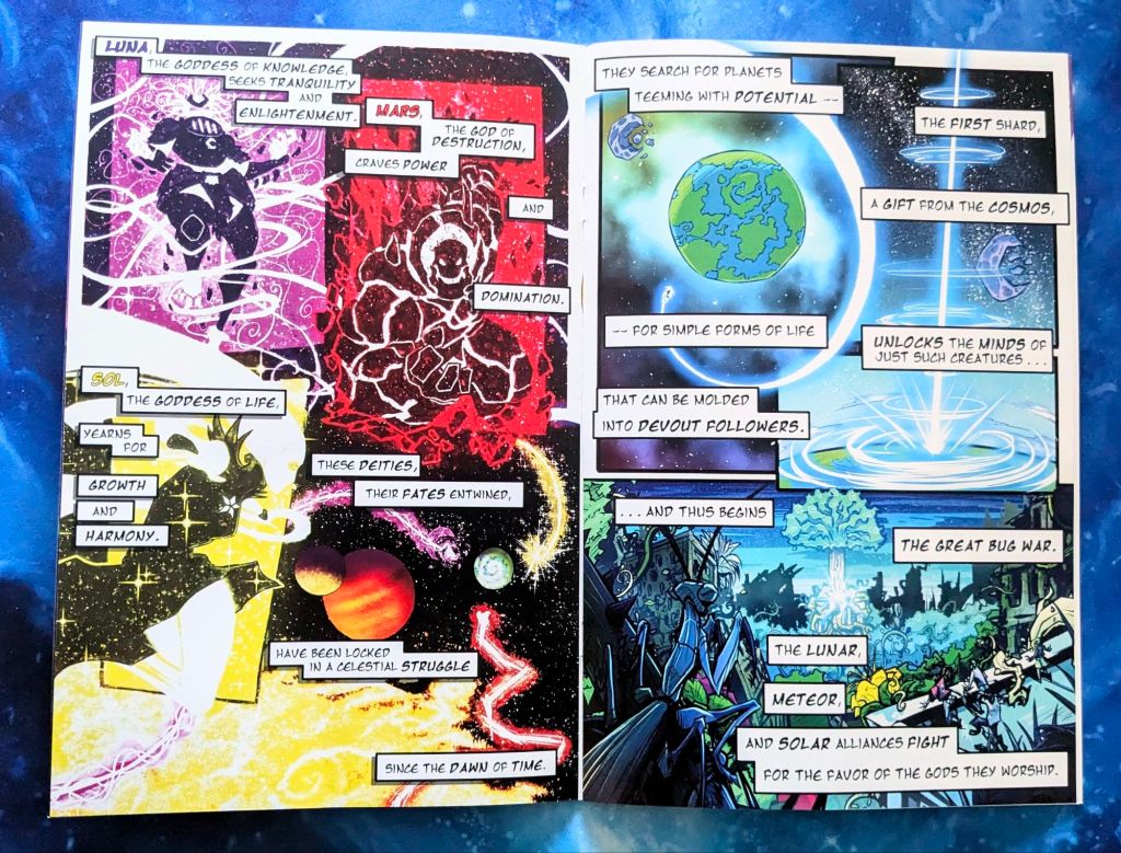 The lore behind the Shard Bugs Trading Card Game (or TCG) is set up in this comic book, which introduces readers to the game’s three factions (four, if you include the unaligned Mercenaries!).