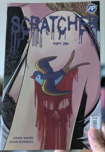 This is a brutal and effective opening chapter to the four part Scratcher mini-series; though there’s a few clumsy and confusing moments in the art, for the most part it’s illustrated in a ln effectively noir-esque way. The monochrome illustrations are atmospheric and the gore somehow more palatable given that the blood runs black across so many panels.
