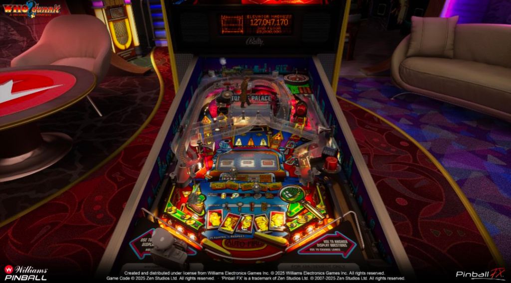 Finally, Who Dunnit is a table with a 1940s ambience and a noir theme, with evidence to be gathered in order for the player to find the culprit in five murder mysteries. There’s some fantastic elements to this table, including a slot machine, simulated roulette and the central gathering of clues to complete mysteries. Due to its central ramp not being all that clear on traditional digital adaptations of Who Dunnit, the VR version does seem to work a lot better.