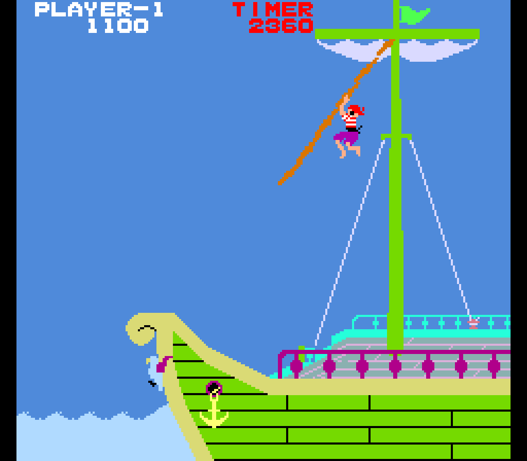 I thought it was familiar; I’ve got Jungle Hunt on the Atari 2600, and apparently, Taito released three near identical games with different themes, with Pirate Pete and Jungle Hunt among them. It’s nicely colourful and varied, with some nice animation,.but it has dated worse even than the older titles on here. Pirate Pete also has some questionable collision detection, and fussy mechanics too.