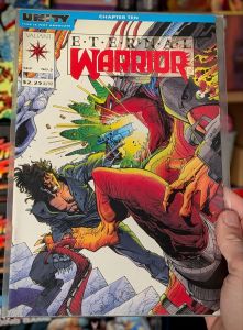 In this issue, Gilad the Eternal Warrior has arrived in the Lost Land and quickly gets involved in numerous battles against enemies led by Mothergod and her horrifically cruel, misogynist son. His brother Aram, aka Armstrong, is also on hand to disappoint and frustrate Gilad with his lack of will to get involved in saving reality itself from Mothergod’s plans. Gilad’s future self is pulled into the Lost Land, and meanwhile Geoff, aka the Geomancer, attempts to confront Mothergod to talk some sense into her. Can Gilad and his future self do enough to help the heroes save reality?