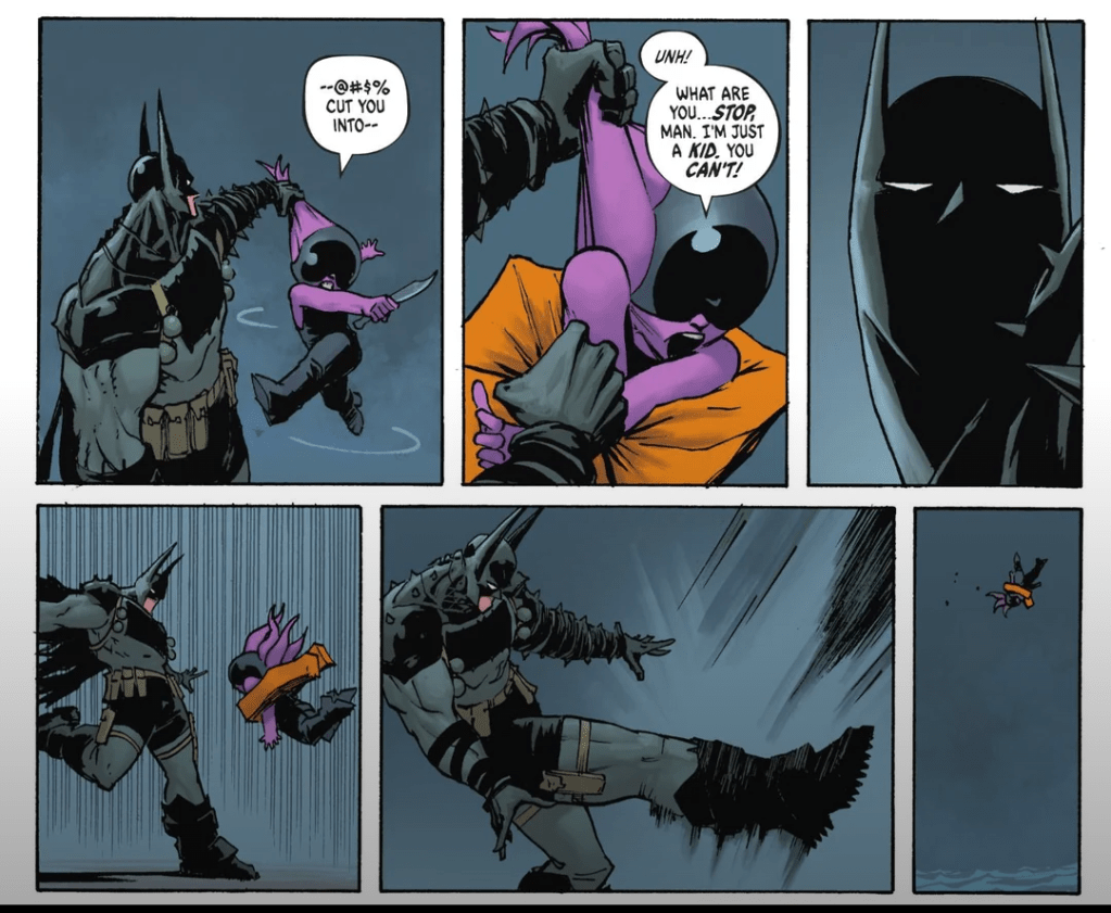 There’s been plenty of fair comment about how Absolute Batman takes many of the worst excesses of 90s ‘extreme‘ comics and just reapplies them. This is a giant Batman with a spiked suit, ears which can be lethal stabbing implements and even a multifunctional, deadly cape, as well as a Bat symbol which doubles as an axe when needed.