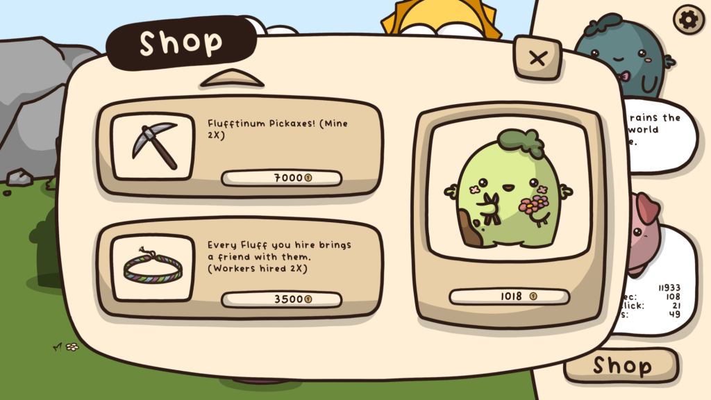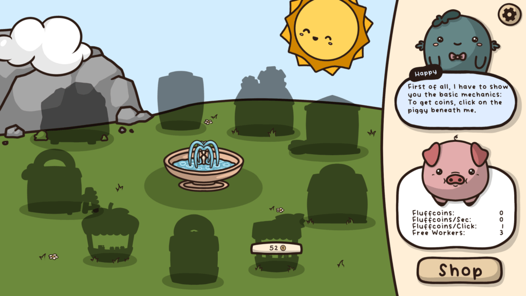 That’s the core gameplay loop, such as it is. A character above the piggy bank gives you background information and tips on progressing in Flufftopia, but you’ll essentially be clicking on different parts of the screen, over and over again.