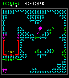 Another abstract oddity, Qix sees you attempting to claim territory on a square plane, using a line to draw squares and to capture as much space as possible without being caught by the fizzing enemies. The risk vs reward system built into the concept makes this one very addictive indeed.