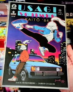 Yes, we’ve seen the rabbit samurai, Miyamoto Usagi (from long-running indie comic, Usagi Yojimbo) outside of his feudal Japan setting before, most notably in Space Usagi and numerous crossovers. However, Usagi Kaitō ’84 is the first time we’ve seen the descendants of Usagi in the 20th century, and what’s more notable is that this seems to be the first Usagi series without script or art from the original creator, Stan Sakai.